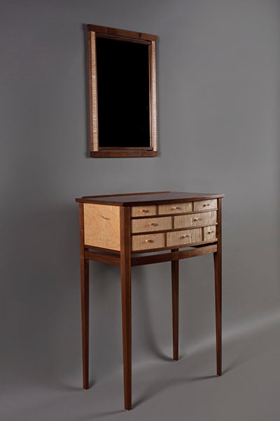 This cabinet is constructed using Black Walnut and Curly Maple. The front of the cabinet is curved with an asymmetric set of 8 drawers. Since the front of the cabinet is curved, the fronts of the drawers are also curved, which made cutting the dovetails challenging. The fronts of the drawers are Curly Maple, the sides and backs are Arbutus and the drawer bottoms are Red Cedar.