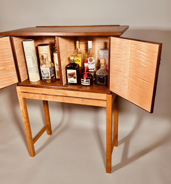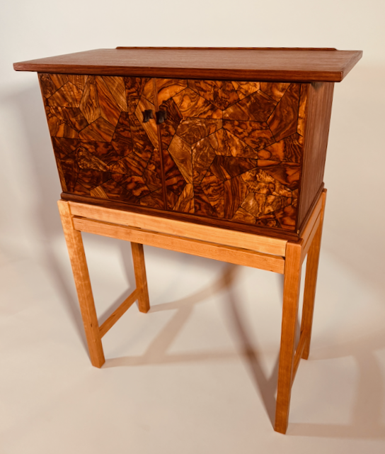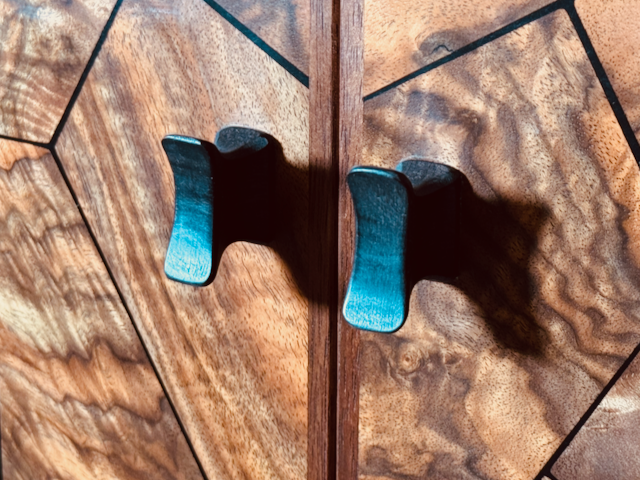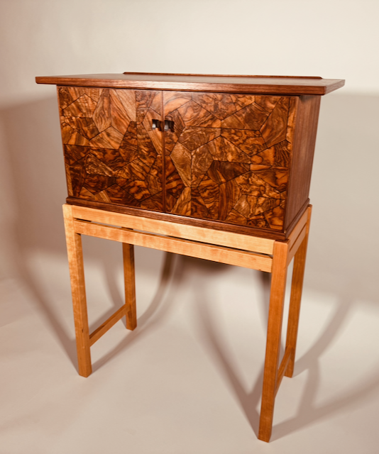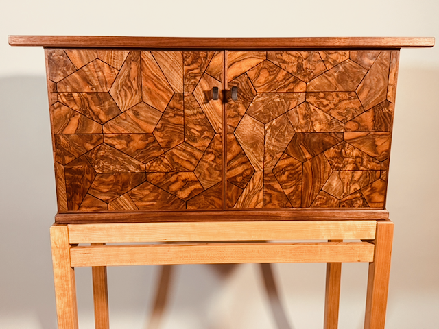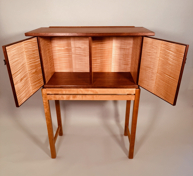 The cabinet features two doors which have pentagonal tiling using Claro Walnut type 13 pentagons. The pentagons were made using shop-sawn veneers that I cut from a nice plank that I had been saving for something special. The inside of the cabinet, including the doors is curly maple from a tree that grew on Vancouver Island.